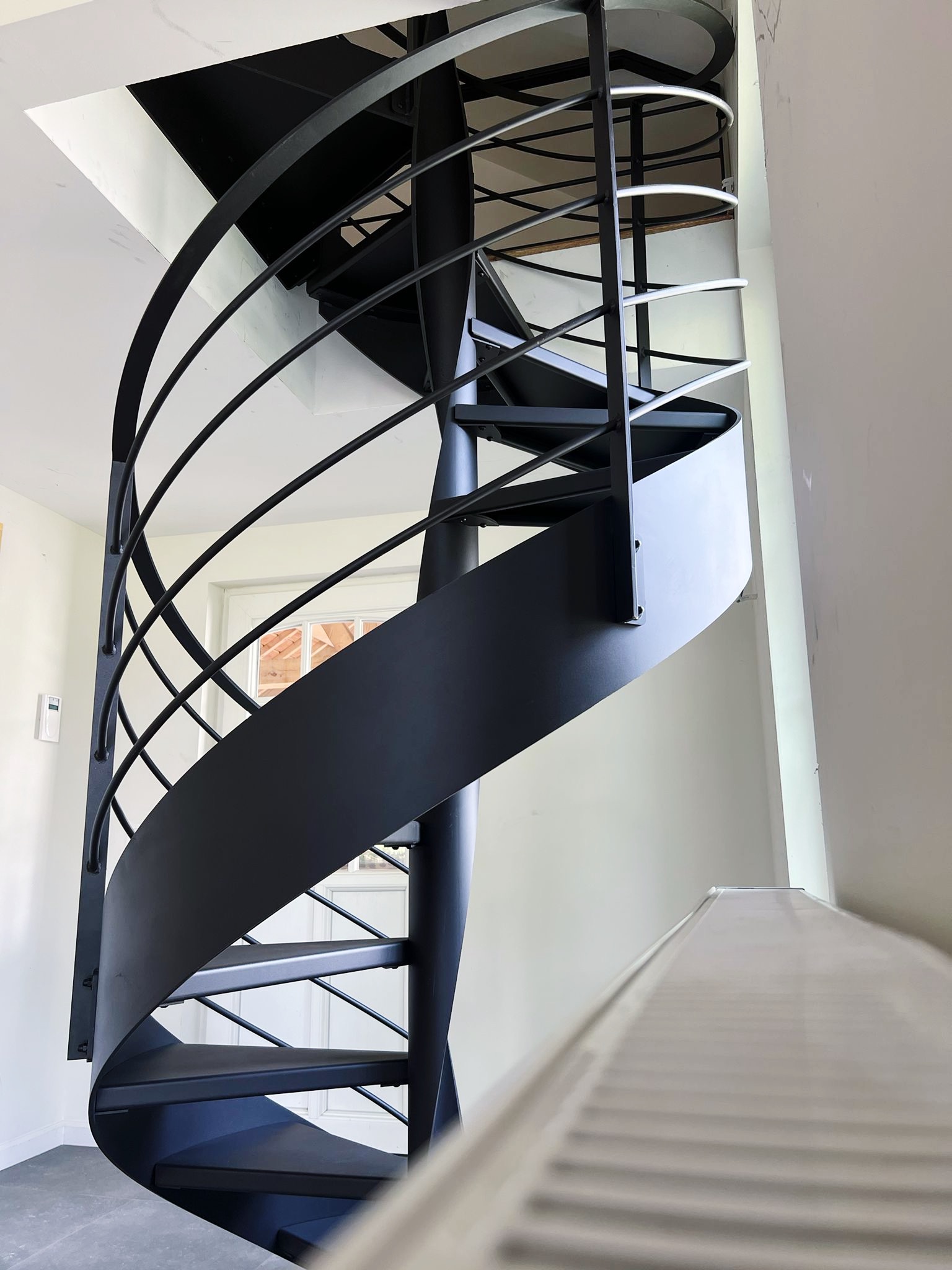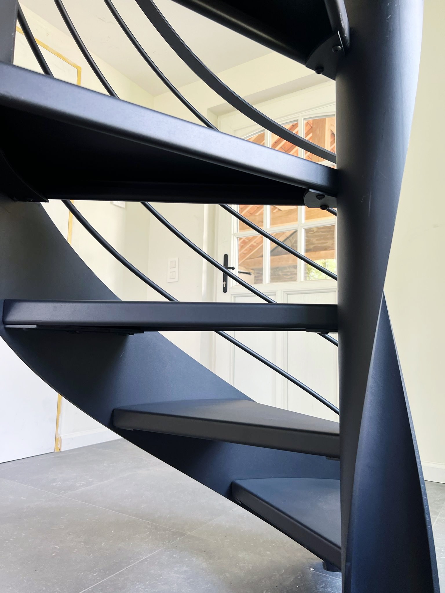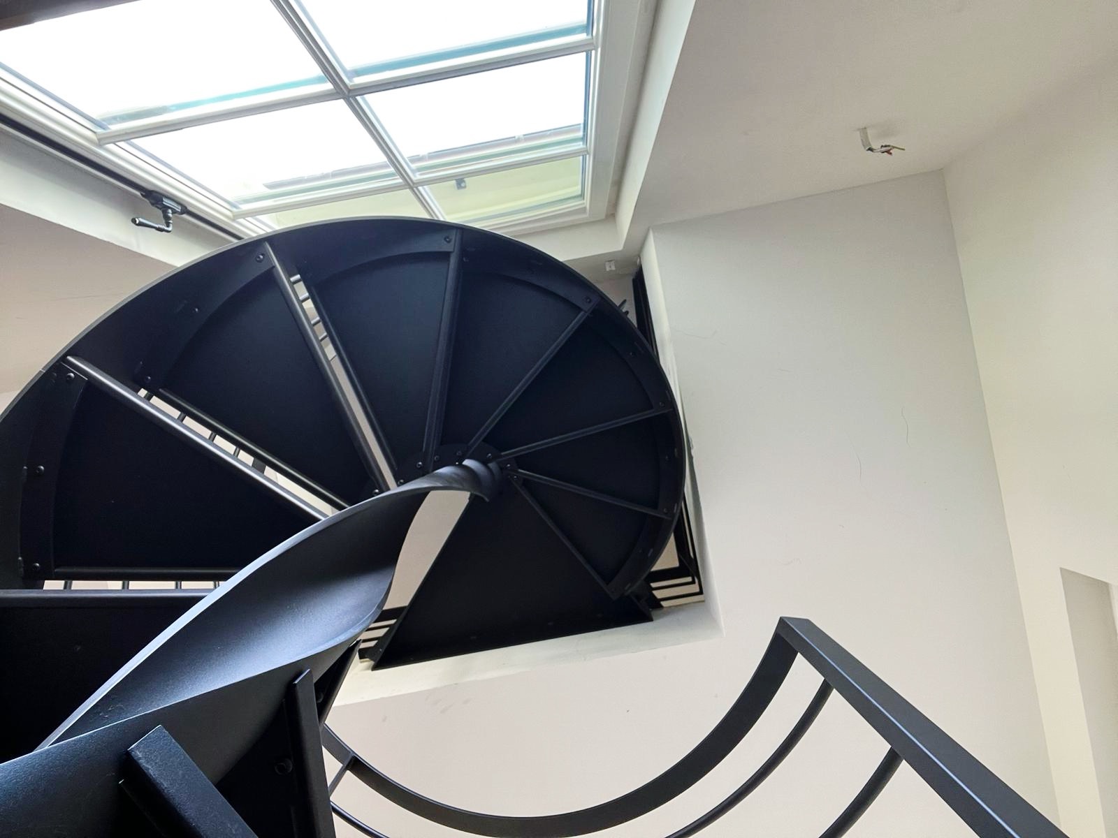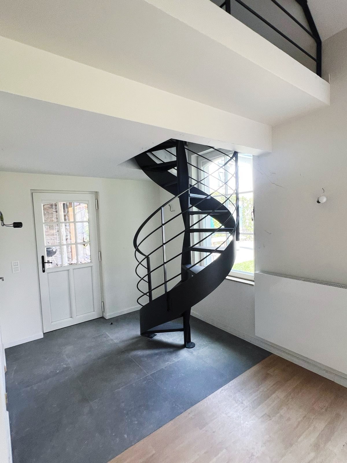 Le projet Bastogne met en œuvre un escalier hélicoïdal sculptural, entièrement réalisé en acier thermolaqué noir. Cette pièce d’exception s’accompagne d’un garde-corps sur-mesure, pour une parfaite cohérence visuelle. L’ensemble combine finesse d’exécution, précision technique et légèreté formelle, dans une spirale élégante et aérienne.