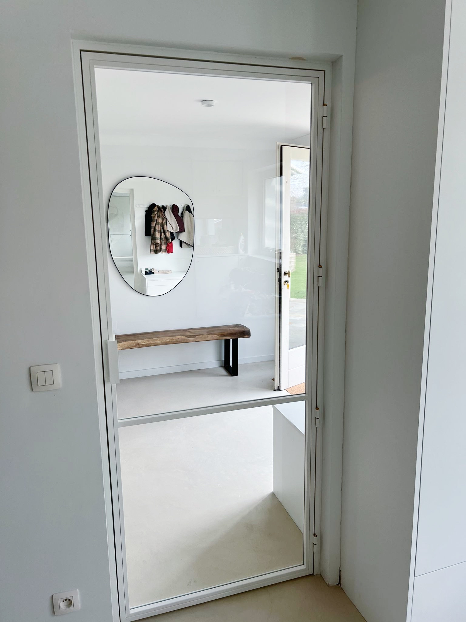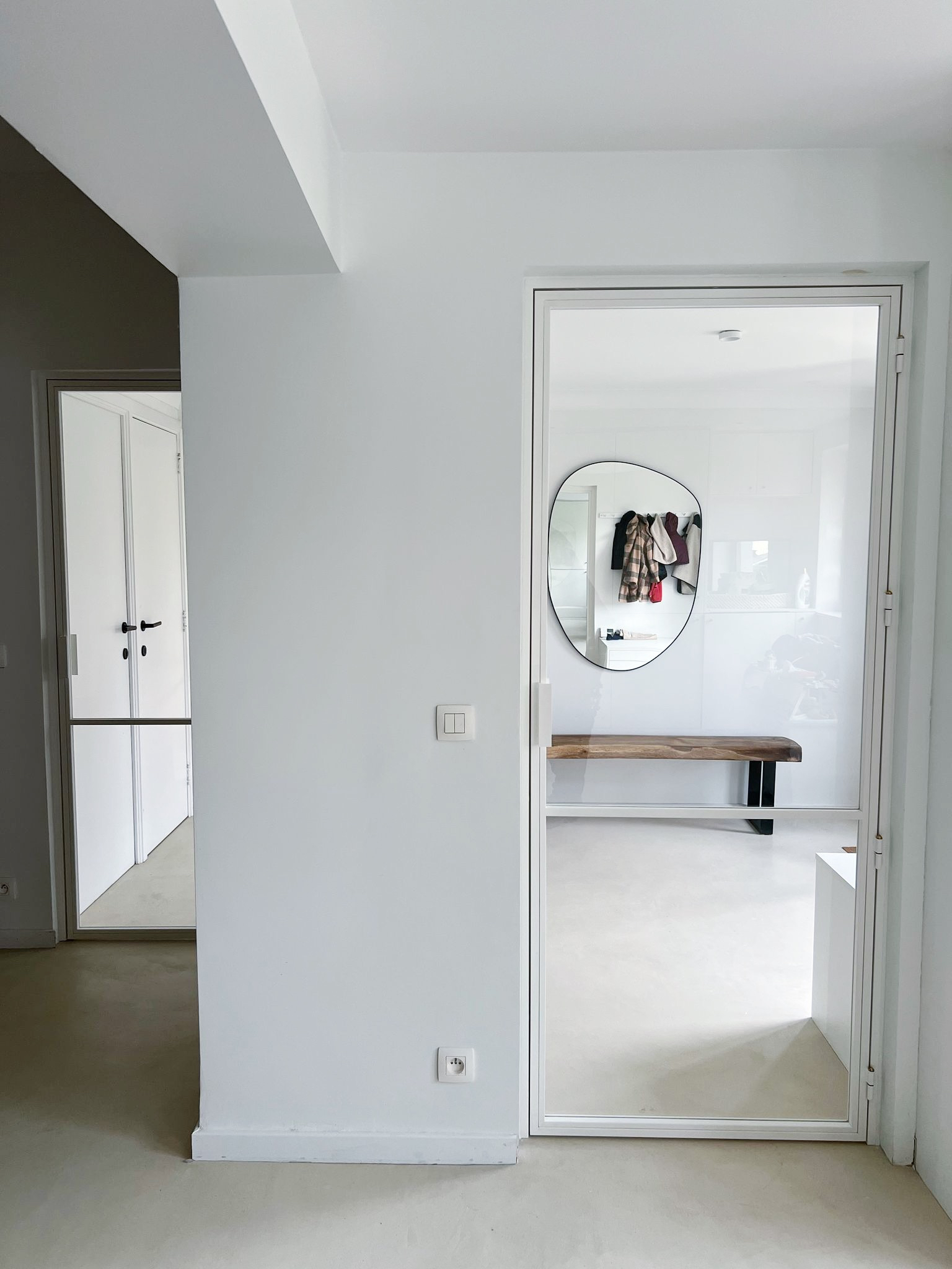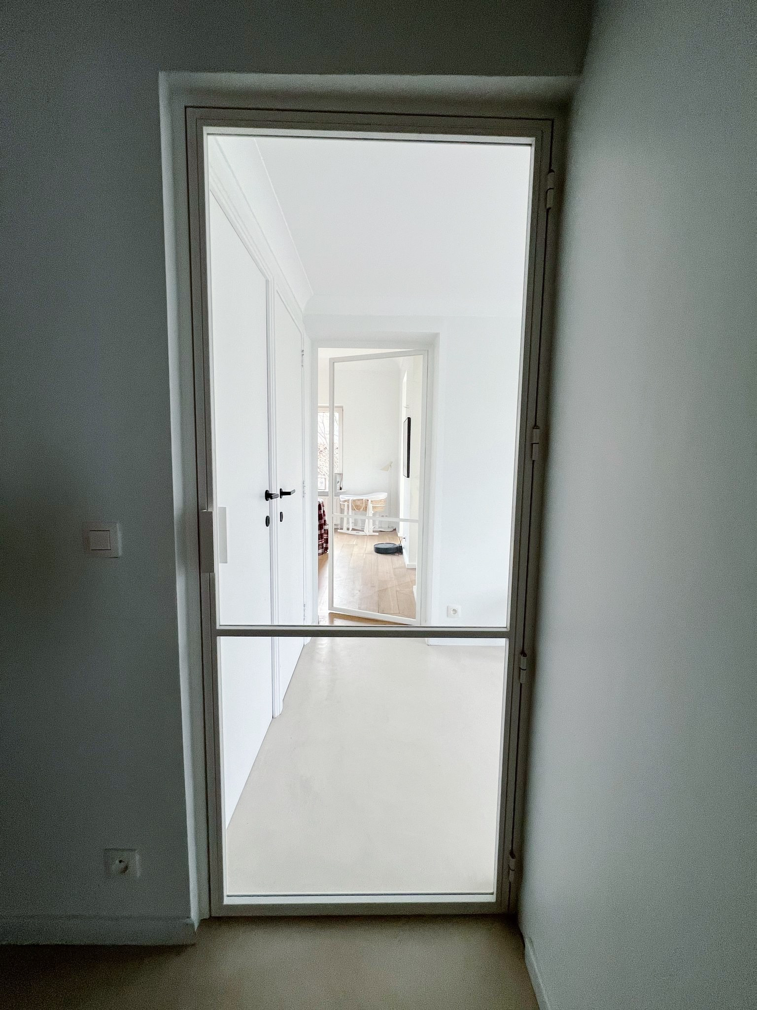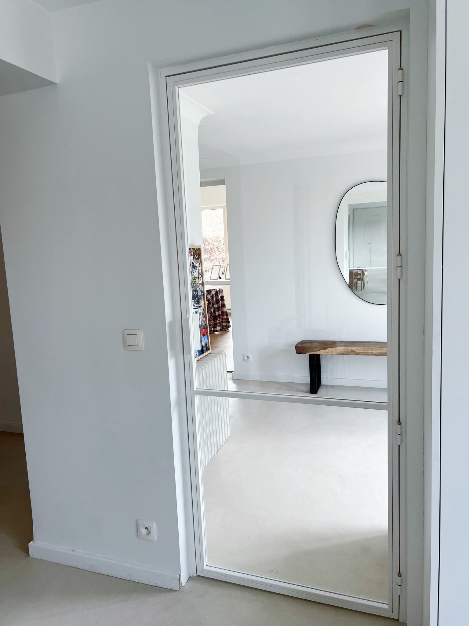 Le projet Pauline II met en valeur la conception et la pose de trois portes intérieures réalisées sur-mesure en acier thermolaqué blanc et verre transparent. Placées dans un hall d’entrée, elles permettent à la lumière naturelle de circuler librement tout en structurant l’espace avec élégance et sobriété.