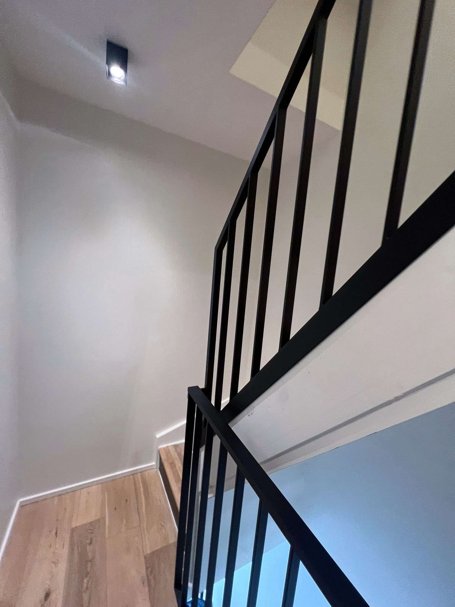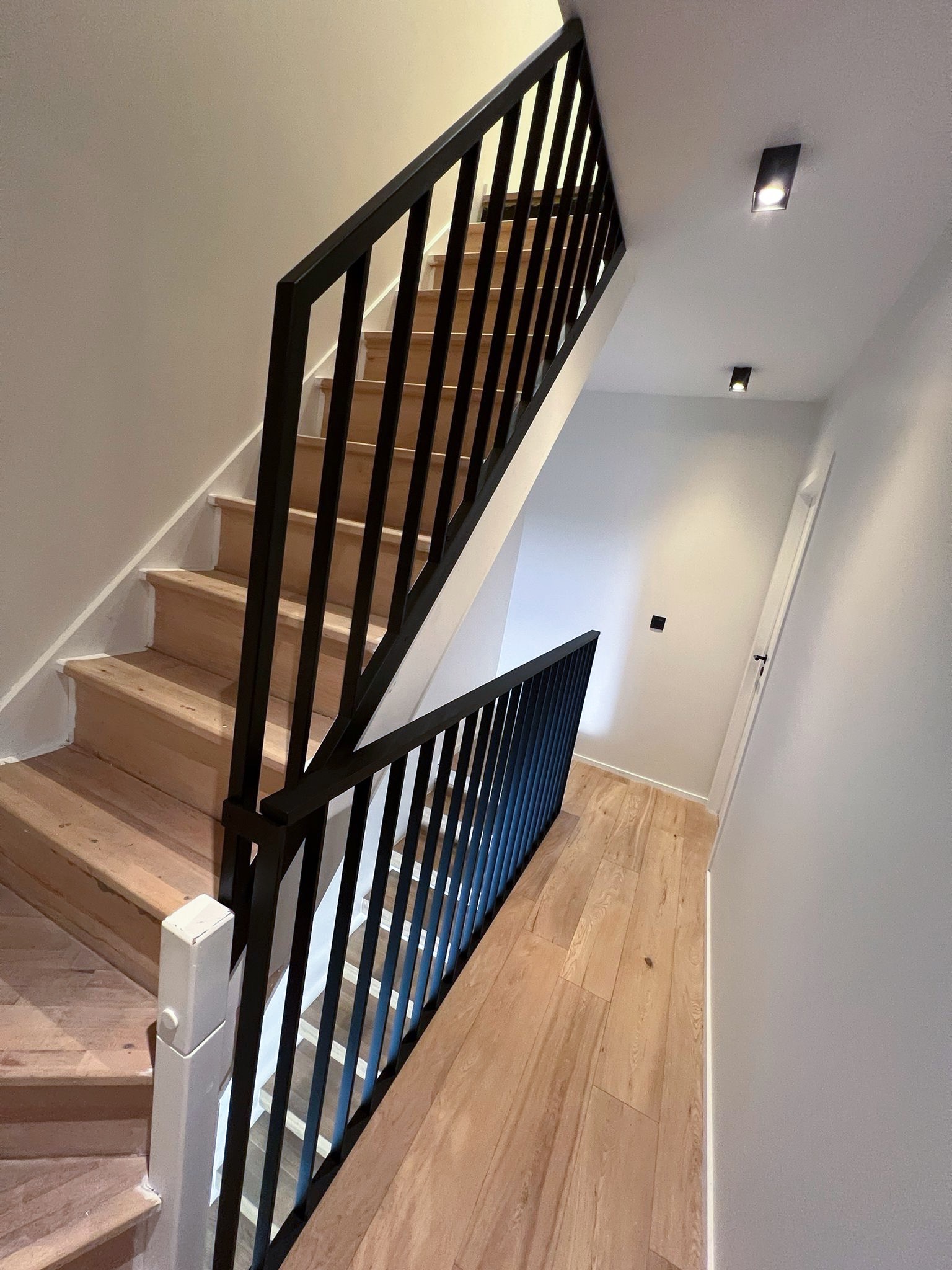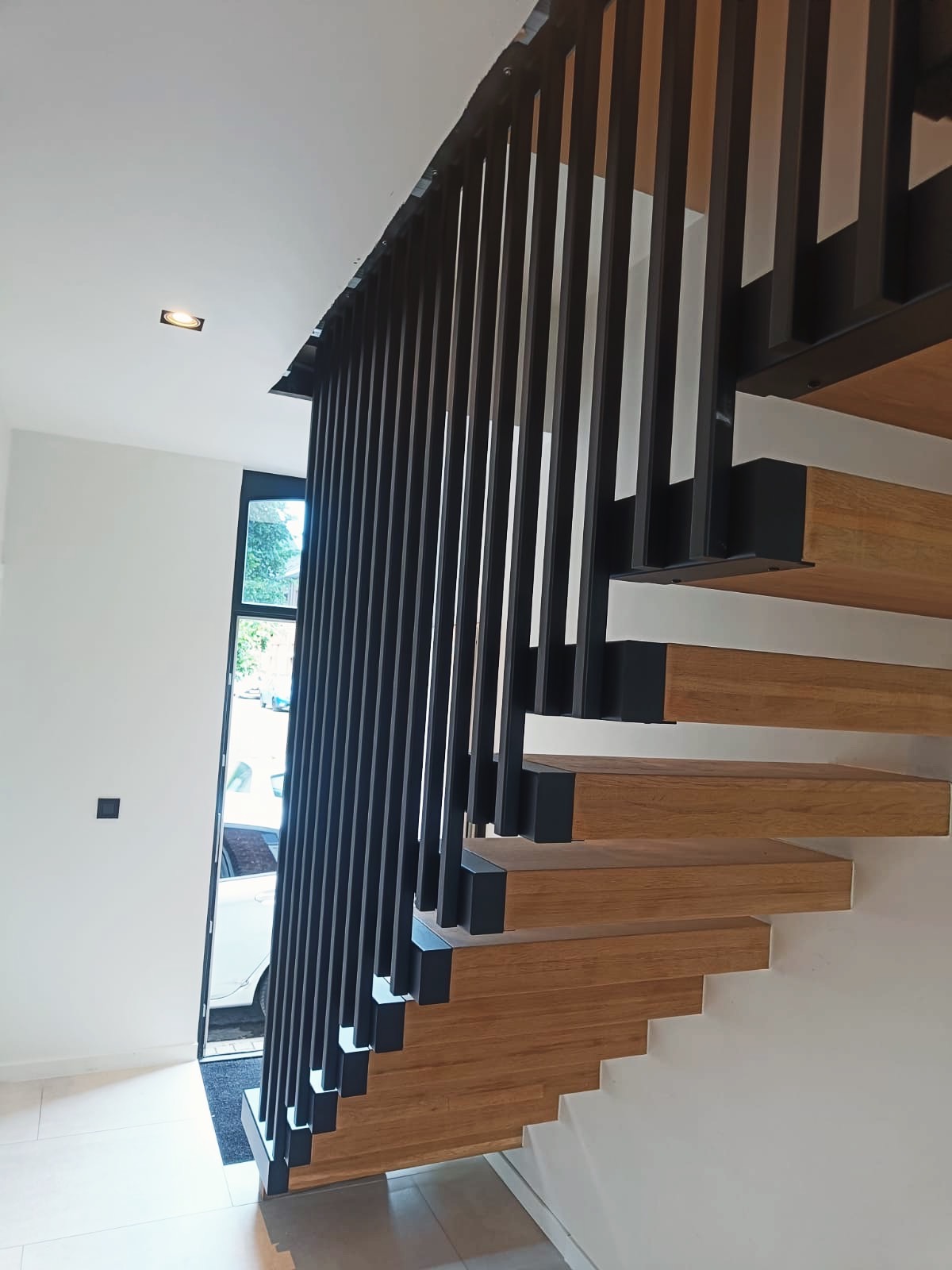 Le projet Reystraat valorise un garde-corps intérieur en acier thermolaqué noir, qui relie les étages avec élégance. Conçu en cohérence avec l’escalier flottant en bois, il renforce la lecture architecturale de l’ensemble et assure à la fois sécurité et légèreté visuelle.