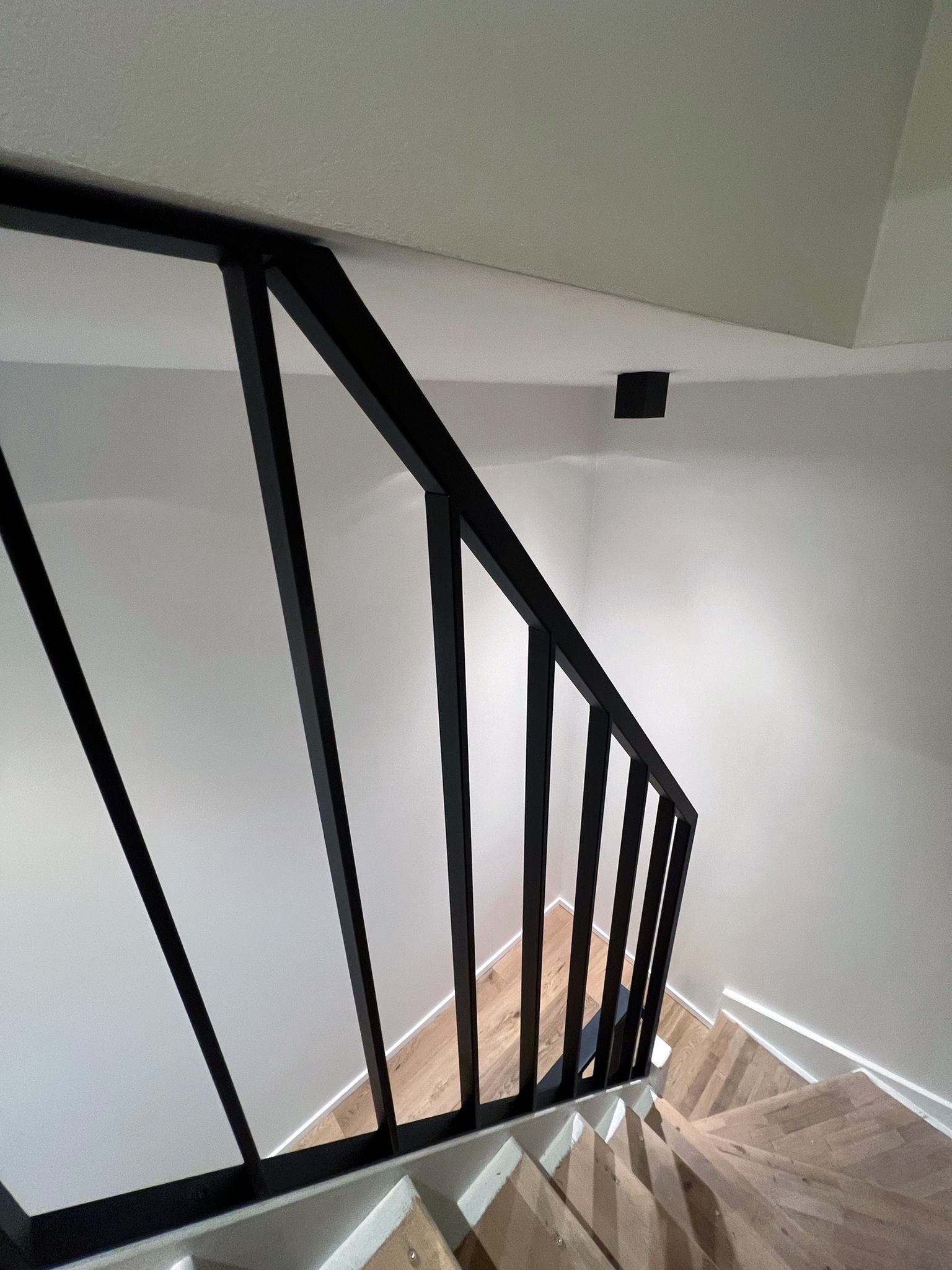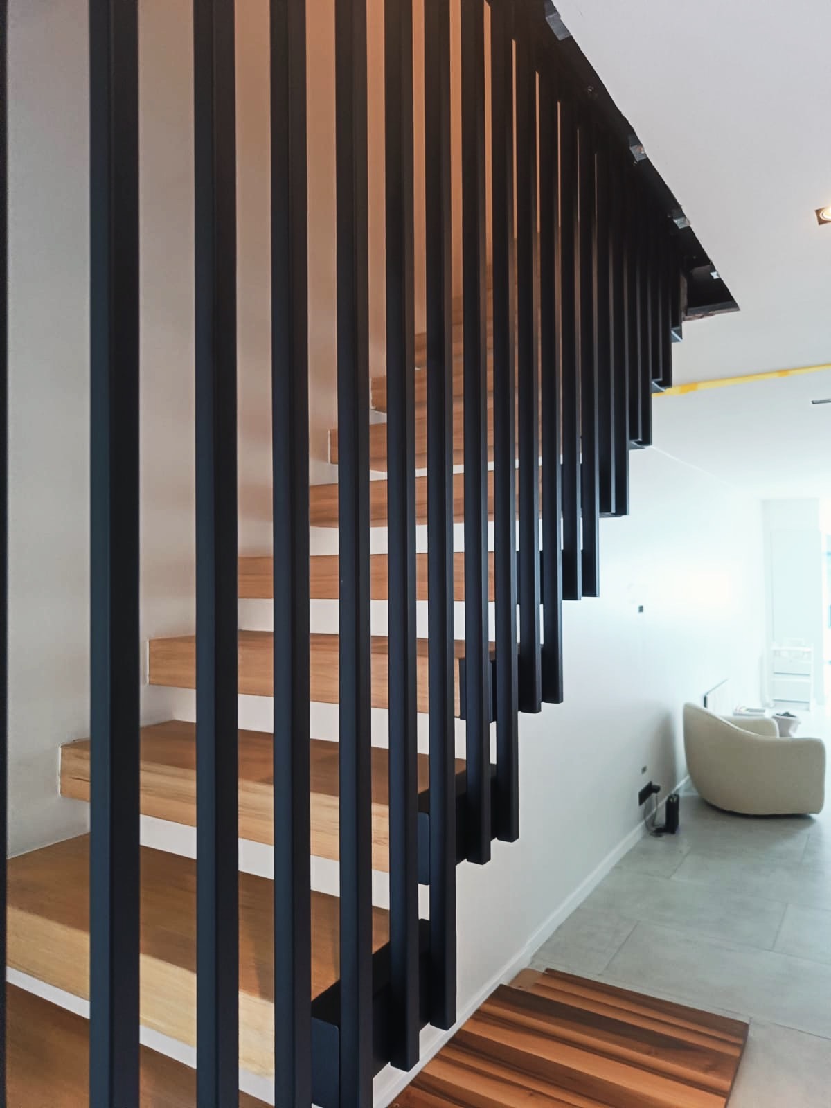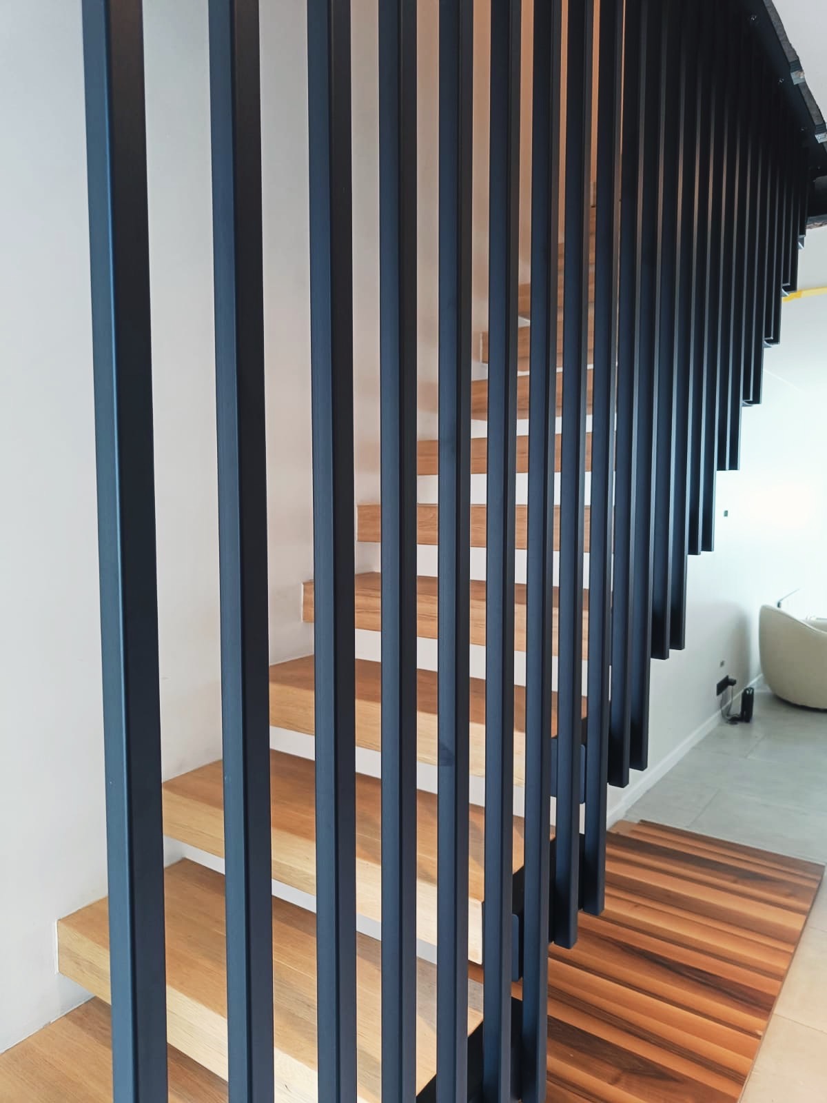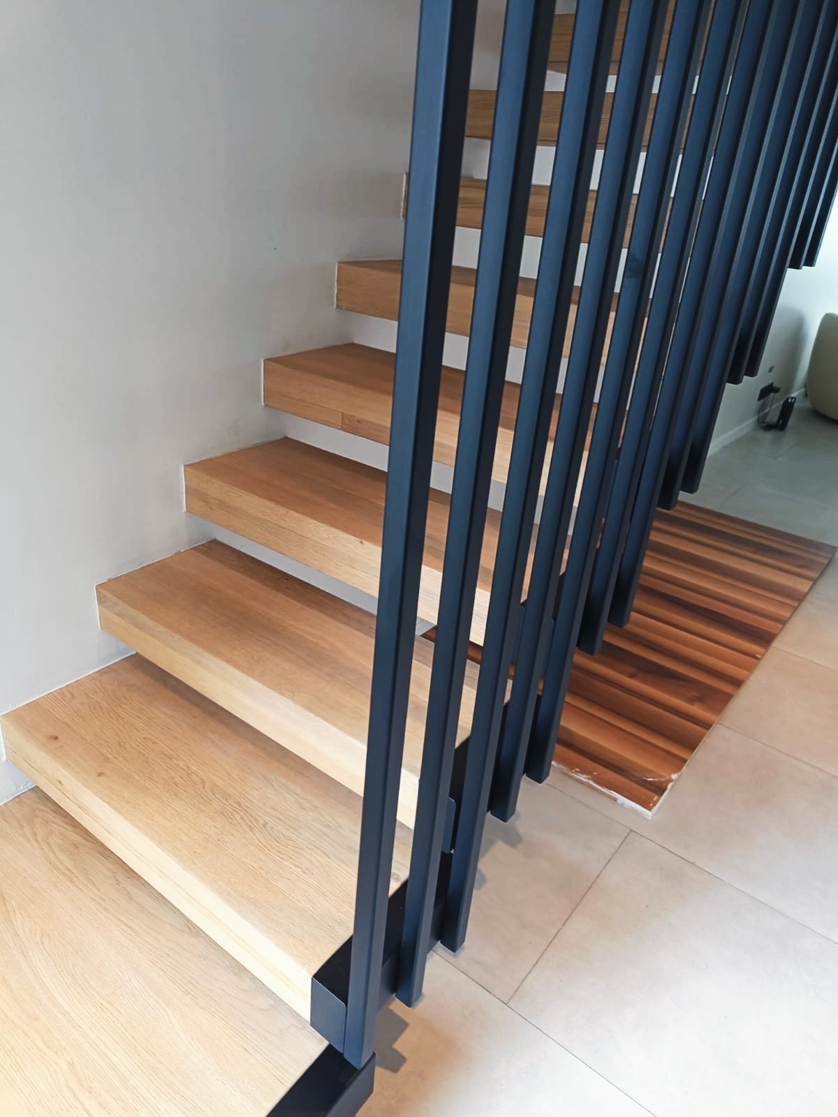 Le projet Reystraat valorise un garde-corps intérieur en acier thermolaqué noir, qui relie les étages avec élégance. Conçu en cohérence avec l’escalier flottant en bois, il renforce la lecture architecturale de l’ensemble et assure à la fois sécurité et légèreté visuelle.