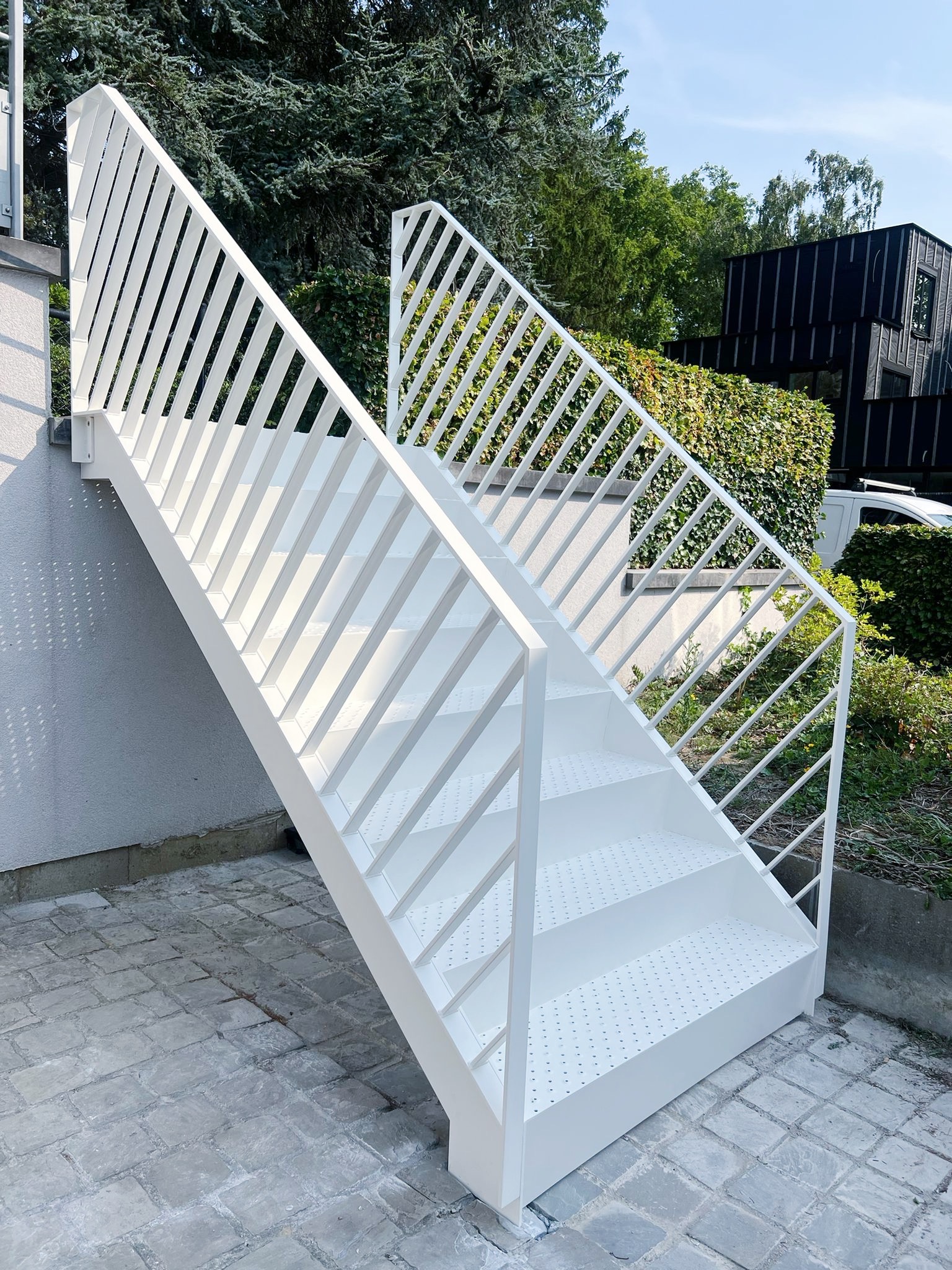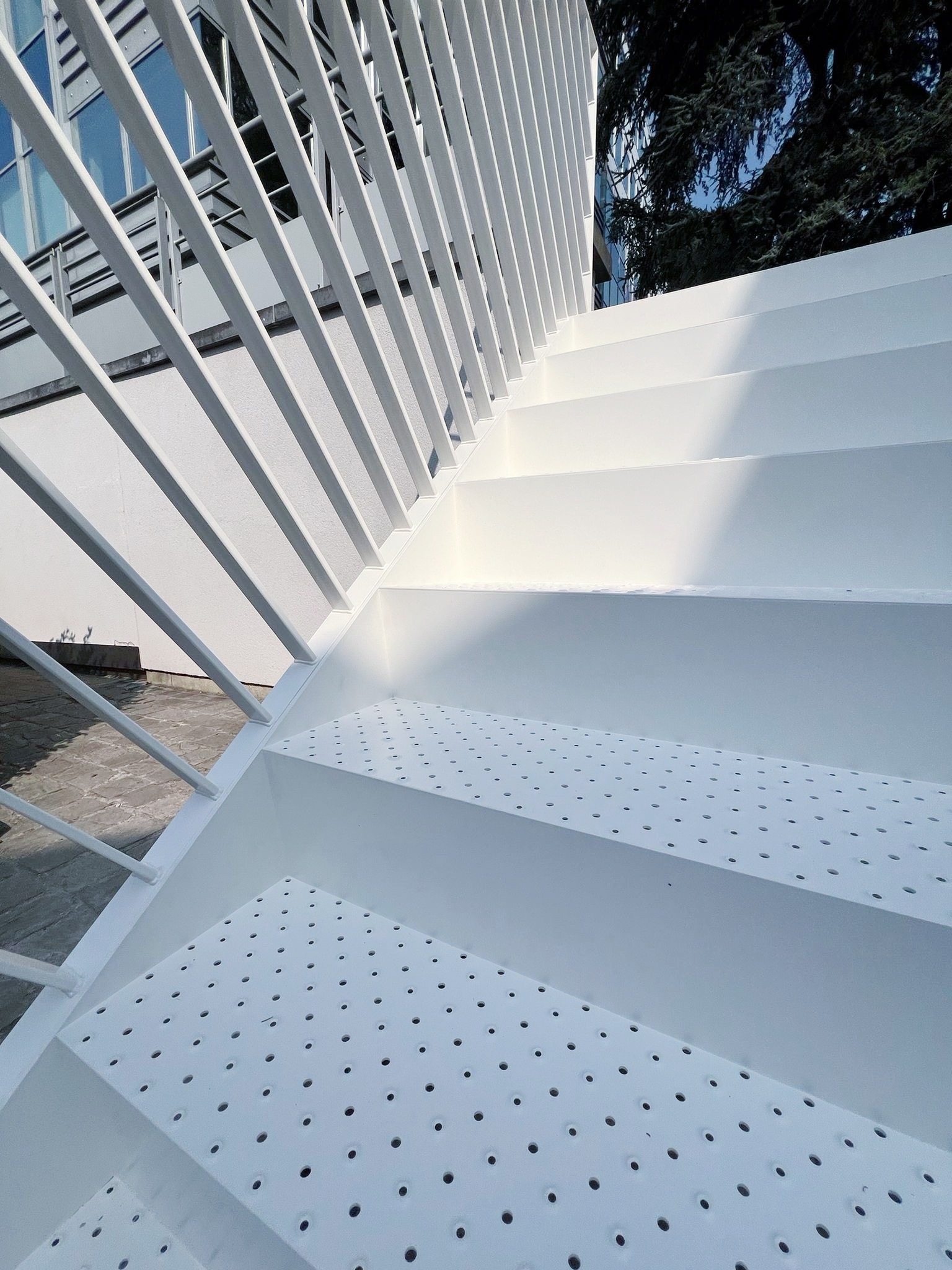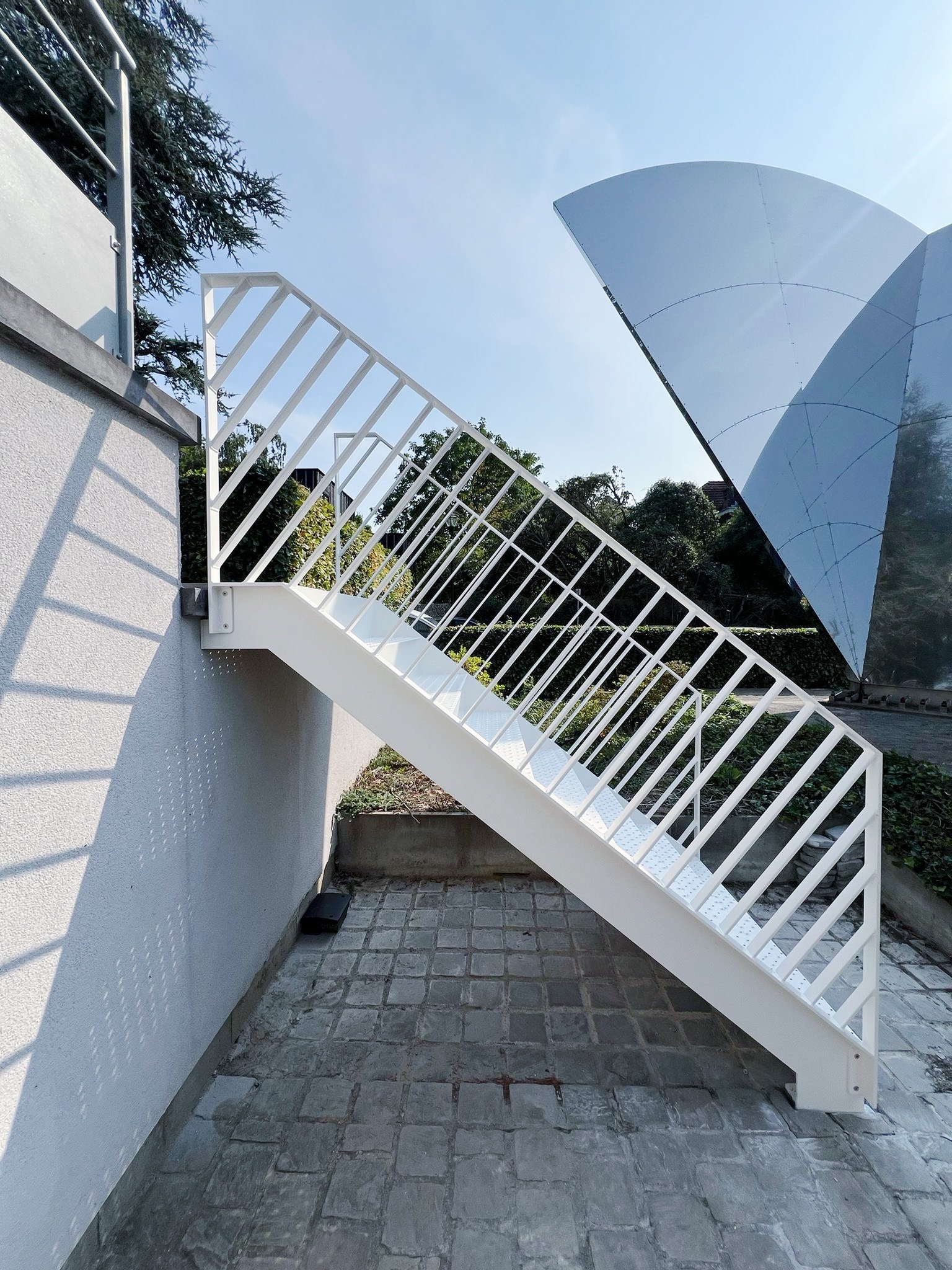 Le projet Strato met en scène un escalier extérieur réalisé en acier thermolaqué blanc. Conçu sur-mesure, il se distingue par ses lignes épurées et sa structure légère, parfaitement intégrée à l’architecture contemporaine. Une combinaison réussie entre esthétisme, durabilité et fonctionnalité.